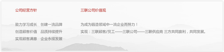 温州三联公司和芜湖三联公司通ISO/TS16949:2002质量体系认证。三联公司一直视顾客的满意是我们永恒的追求!团结拼搏,锐意创新,三联公司为成为锻造领域中一流企业而努。